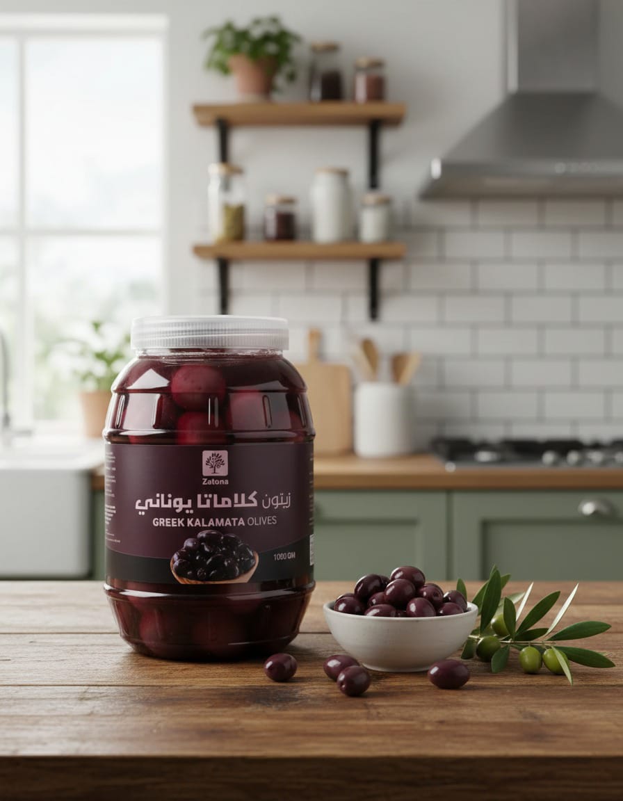 - زيتون كلاماتا يوناني أصلي، يتميز بلونه البنفسجي الداكن، شكله اللوزي، وقوامه اللحمي الغني.