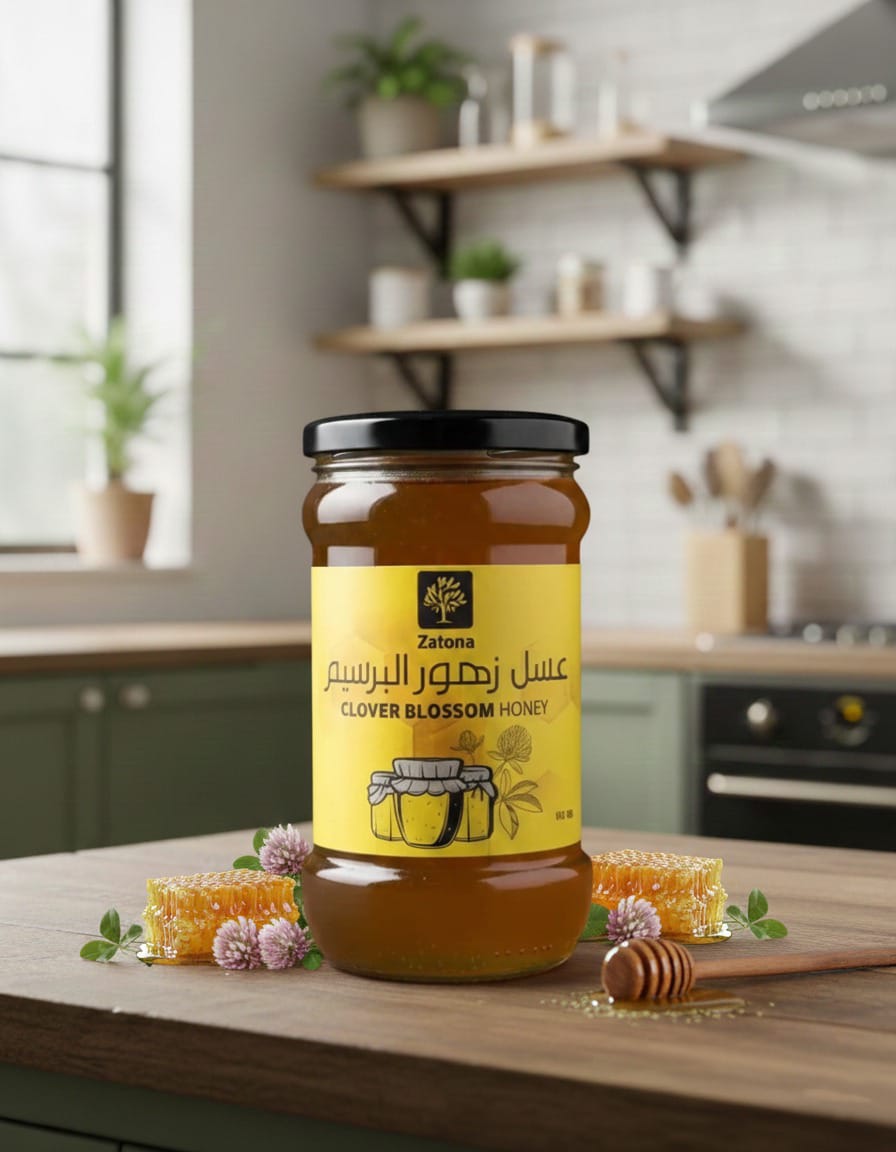 - عسل زهور البرسيم الطبيعي ١٠٠٪، يتميز بلونه الذهبي الفاتح، طعمه الحلو المعتدل، وقوامه الناعم.